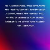 His master replied, 'Well done, good and faithful servant! You have been faithful with a few things; I will put you in charge of many things. Enter into the joy of your master!'