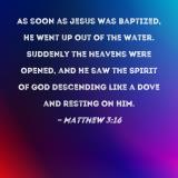 As soon as Jesus was baptized, He went up out of the water. Suddenly the heavens were opened, and He saw the Spirit of God descending like a dove and resting on Him.
