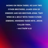 Going on from there, He saw two other brothers, James son of Zebedee and his brother John. They were in a boat with their father Zebedee, mending their nets. Jesus called them,