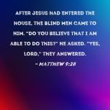 After Jesus had entered the house, the blind men came to Him. "Do you believe that I am able to do this?" He asked. "Yes, Lord," they answered.