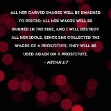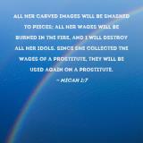 All her carved images will be smashed to pieces; all her wages will be burned in the fire, and I will destroy all her idols. Since she collected the wages of a prostitute, they will be used again on a prostitute.