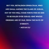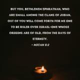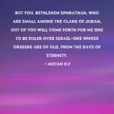 But you, Bethlehem Ephrathah, who are small among the clans of Judah, out of you will come forth for Me One to be ruler over Israel--One whose origins are of old, from the days of eternity.
