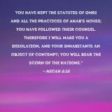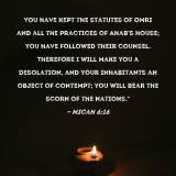 Pictures and Artwork You have kept the statutes of Omri and all the practices of Ahab's house; you have followed their counsel. Therefore I will make you a desolation, and your inhabitants an object of contempt; you will bear the scorn of the nations." |