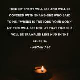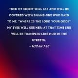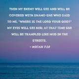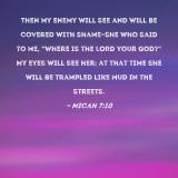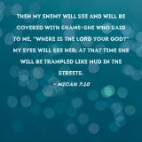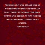 Then my enemy will see and will be covered with shame--she who said to me, "Where is the LORD your God?" My eyes will see her; at that time she will be trampled like mud in the streets.