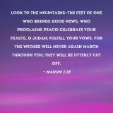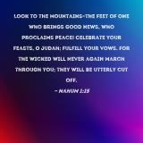 Look to the mountains--the feet of one who brings good news, who proclaims peace! Celebrate your feasts, O Judah; fulfill your vows. For the wicked will never again march through you; they will be utterly cut off.