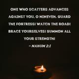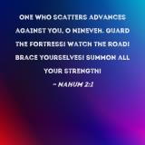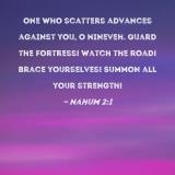 One who scatters advances against you, O Nineveh. Guard the fortress! Watch the road! Brace yourselves! Summon all your strength!