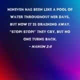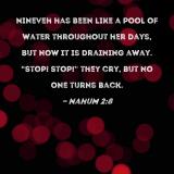 Nineveh has been like a pool of water throughout her days, but now it is draining away. "Stop! Stop!" they cry, but no one turns back.