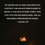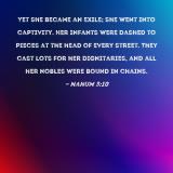 Yet she became an exile; she went into captivity. Her infants were dashed to pieces at the head of every street. They cast lots for her dignitaries, and all her nobles were bound in chains.