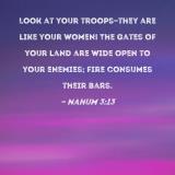Look at your troops--they are like your women! The gates of your land are wide open to your enemies; fire consumes their bars.