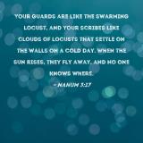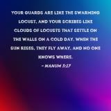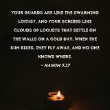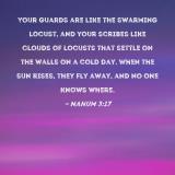 Your guards are like the swarming locust, and your scribes like clouds of locusts that settle on the walls on a cold day. When the sun rises, they fly away, and no one knows where.