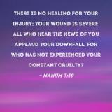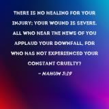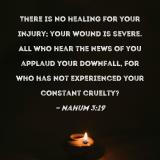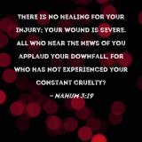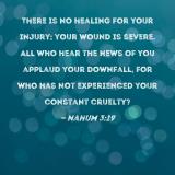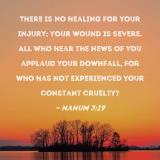 There is no healing for your injury; your wound is severe. All who hear the news of you applaud your downfall, for who has not experienced your constant cruelty?