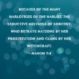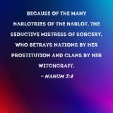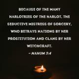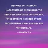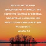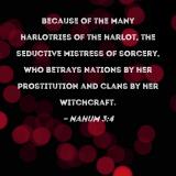 because of the many harlotries of the harlot, the seductive mistress of sorcery, who betrays nations by her prostitution and clans by her witchcraft.