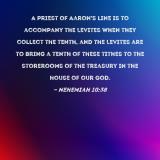 A priest of Aaron's line is to accompany the Levites when they collect the tenth, and the Levites are to bring a tenth of these tithes to the storerooms of the treasury in the house of our God.