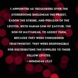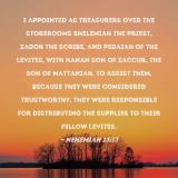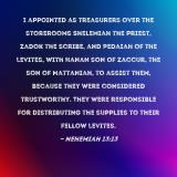 Pictures and Artwork I appointed as treasurers over the storerooms Shelemiah the priest, Zadok the scribe, and Pedaiah of the Levites, with Hanan son of Zaccur, the son of Mattaniah, to assist them, because they were considered trustworthy. They were responsible for distributing the supplies to their fellow Levites. |