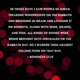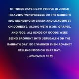 Pictures and Artwork In those days I saw people in Judah treading winepresses on the Sabbath and bringing in grain and loading it on donkeys, along with wine, grapes, and figs. All kinds of goods were being brought into Jerusalem on the Sabbath day. So I warned them against selling food on that day. |