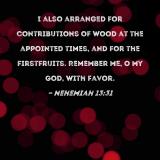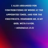 I also arranged for contributions of wood at the appointed times, and for the firstfruits. Remember me, O my God, with favor.