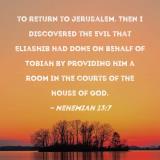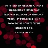 to return to Jerusalem. Then I discovered the evil that Eliashib had done on behalf of Tobiah by providing him a room in the courts of the house of God.