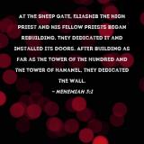 At the Sheep Gate, Eliashib the high priest and his fellow priests began rebuilding. They dedicated it and installed its doors. After building as far as the Tower of the Hundred and the Tower of Hananel, they dedicated the wall.