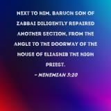 Next to him, Baruch son of Zabbai diligently repaired another section, from the angle to the doorway of the house of Eliashib the high priest.