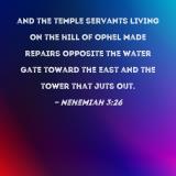 and the temple servants living on the hill of Ophel made repairs opposite the Water Gate toward the east and the tower that juts out.