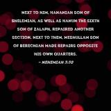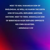Next to him, Hananiah son of Shelemiah, as well as Hanun the sixth son of Zalaph, repaired another section. Next to them, Meshullam son of Berechiah made repairs opposite his own quarters.