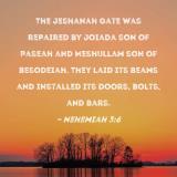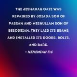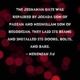 The Jeshanah Gate was repaired by Joiada son of Paseah and Meshullam son of Besodeiah. They laid its beams and installed its doors, bolts, and bars.