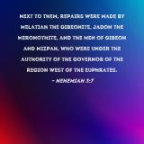Next to them, repairs were made by Melatiah the Gibeonite, Jadon the Meronothite, and the men of Gibeon and Mizpah, who were under the authority of the governor of the region west of the Euphrates.