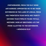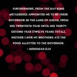 Pictures and Artwork Furthermore, from the day King Artaxerxes appointed me to be their governor in the land of Judah, from his twentieth year until his thirty-second year (twelve years total), neither I nor my brothers ate the food allotted to the governor. |