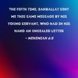 The fifth time, Sanballat sent me this same message by his young servant, who had in his hand an unsealed letter