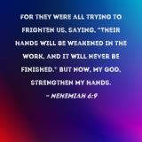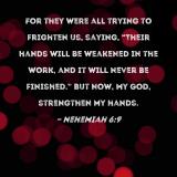For they were all trying to frighten us, saying, "Their hands will be weakened in the work, and it will never be finished." But now, my God, strengthen my hands.