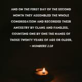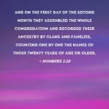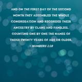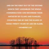 and on the first day of the second month they assembled the whole congregation and recorded their ancestry by clans and families, counting one by one the names of those twenty years of age or older,