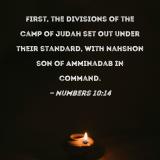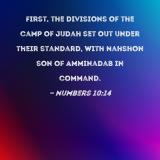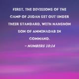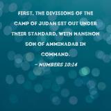 First, the divisions of the camp of Judah set out under their standard, with Nahshon son of Amminadab in command.
