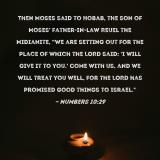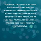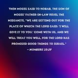 Pictures and Artwork Then Moses said to Hobab, the son of Moses' father-in-law Reuel the Midianite, "We are setting out for the place of which the LORD said: 'I will give it to you.' Come with us, and we will treat you well, for the LORD has promised good things to Israel." |