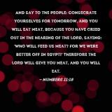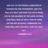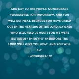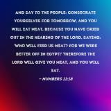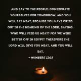 Pictures and Artwork And say to the people: Consecrate yourselves for tomorrow, and you will eat meat, because you have cried out in the hearing of the LORD, saying: 'Who will feed us meat? For we were better off in Egypt!' Therefore the LORD will give you meat, and you will eat. |