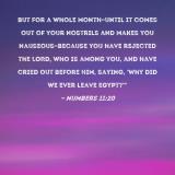but for a whole month--until it comes out of your nostrils and makes you nauseous--because you have rejected the LORD, who is among you, and have cried out before Him, saying, 'Why did we ever leave Egypt?'"