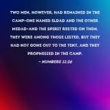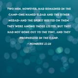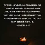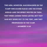 Two men, however, had remained in the camp--one named Eldad and the other Medad--and the Spirit rested on them. They were among those listed, but they had not gone out to the tent, and they prophesied in the camp.