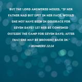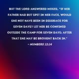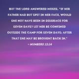 But the LORD answered Moses, "If her father had but spit in her face, would she not have been in disgrace for seven days? Let her be confined outside the camp for seven days; after that she may be brought back in."