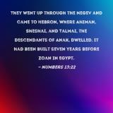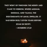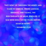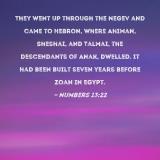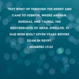 They went up through the Negev and came to Hebron, where Ahiman, Sheshai, and Talmai, the descendants of Anak, dwelled. It had been built seven years before Zoan in Egypt.