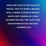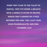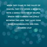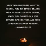 When they came to the Valley of Eshcol, they cut down a branch with a single cluster of grapes, which they carried on a pole between two men. They also took some pomegranates and figs.