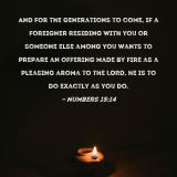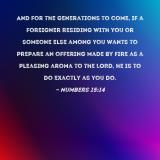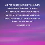 And for the generations to come, if a foreigner residing with you or someone else among you wants to prepare an offering made by fire as a pleasing aroma to the LORD, he is to do exactly as you do.