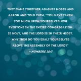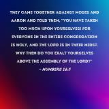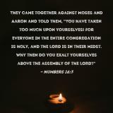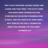 Pictures and Artwork They came together against Moses and Aaron and told them, "You have taken too much upon yourselves! For everyone in the entire congregation is holy, and the LORD is in their midst. Why then do you exalt yourselves above the assembly of the LORD?" |