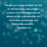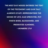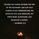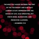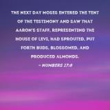 The next day Moses entered the Tent of the Testimony and saw that Aaron's staff, representing the house of Levi, had sprouted, put forth buds, blossomed, and produced almonds.
