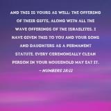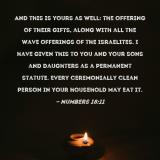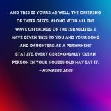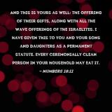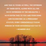 Pictures and Artwork And this is yours as well: the offering of their gifts, along with all the wave offerings of the Israelites. I have given this to you and your sons and daughters as a permanent statute. Every ceremonially clean person in your household may eat it. |