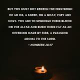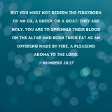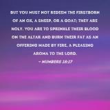 But you must not redeem the firstborn of an ox, a sheep, or a goat; they are holy. You are to sprinkle their blood on the altar and burn their fat as an offering made by fire, a pleasing aroma to the LORD.