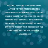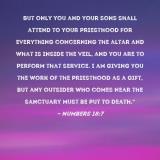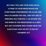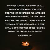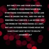 Pictures and Artwork But only you and your sons shall attend to your priesthood for everything concerning the altar and what is inside the veil, and you are to perform that service. I am giving you the work of the priesthood as a gift, but any outsider who comes near the sanctuary must be put to death." |