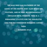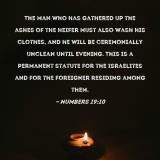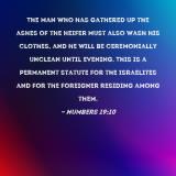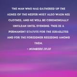 The man who has gathered up the ashes of the heifer must also wash his clothes, and he will be ceremonially unclean until evening. This is a permanent statute for the Israelites and for the foreigner residing among them.