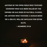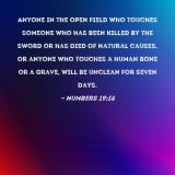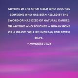 Anyone in the open field who touches someone who has been killed by the sword or has died of natural causes, or anyone who touches a human bone or a grave, will be unclean for seven days.