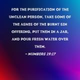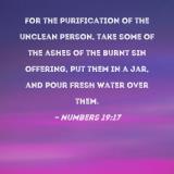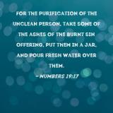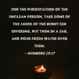 For the purification of the unclean person, take some of the ashes of the burnt sin offering, put them in a jar, and pour fresh water over them.