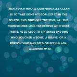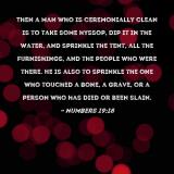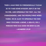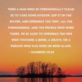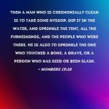 Pictures and Artwork Then a man who is ceremonially clean is to take some hyssop, dip it in the water, and sprinkle the tent, all the furnishings, and the people who were there. He is also to sprinkle the one who touched a bone, a grave, or a person who has died or been slain. |
