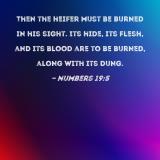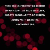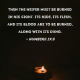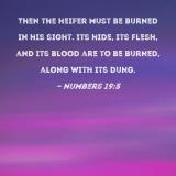 Then the heifer must be burned in his sight. Its hide, its flesh, and its blood are to be burned, along with its dung.